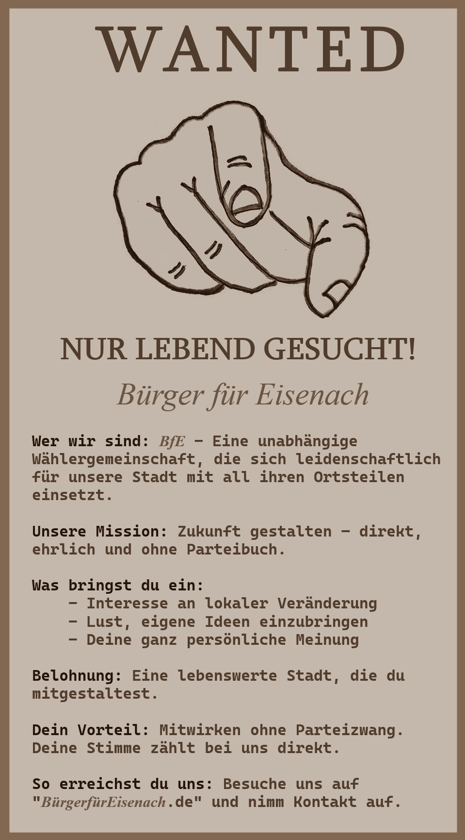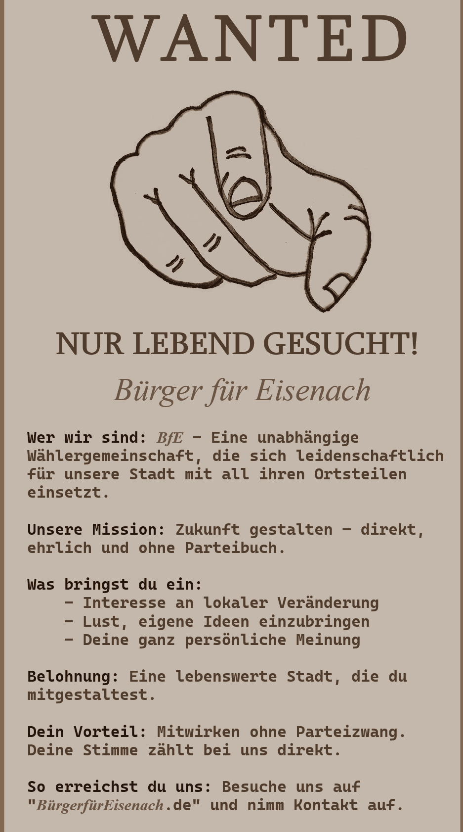 Die Bürger für Eisenach haben Zeit ihres Bestehens eine ruhige, sachliche Politik unterstützt. Wir sind berechenbare und verlässliche Partner, wenn kritisches Mitdenken, Mitentscheiden und Mitverantworten gefragt sind. Die aktiven und engagierten Mitglieder der Wählergemeinschaft BfE bringen breitgefächerten Sachverstand ein. Schaumschlägerei, bewusstes Erzielen öffentlicher Resonanz - dies alles lehnen wir ab. Wir werden auch weiterhin eine seriöse, ernst zu nehmende, nachverfolgbare und nachhaltige Politik unterstützen und mitgestalten.