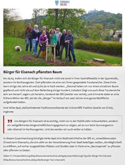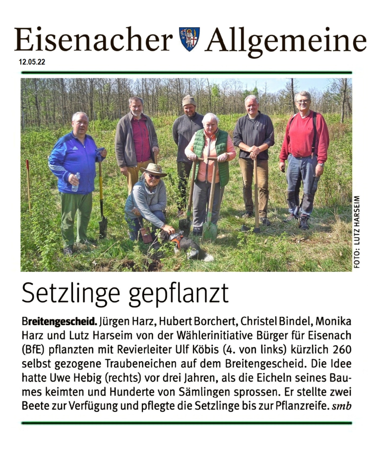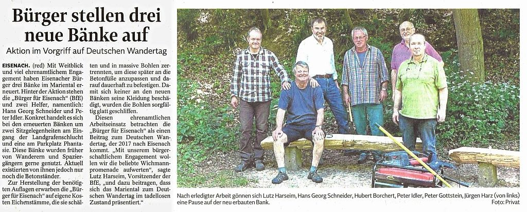 In Eisenach gibt es ein starkes bürgerschaftliches Engagement, das sich in verschiedenen Bereichen zeigt. Unsere Wählergemeinschaft BfE setzt sich aktiv für die Verbesserung des Miteinander in unserer Stadt ein, sei es durch ehrenamtliche Arbeit, das Aufstellen von Bänken im Mariental oder im Helltal, Pflanzen von Bäumen und Rosenstöcken oder durch die Unterstützung lokaler Vereine und Initiativen.